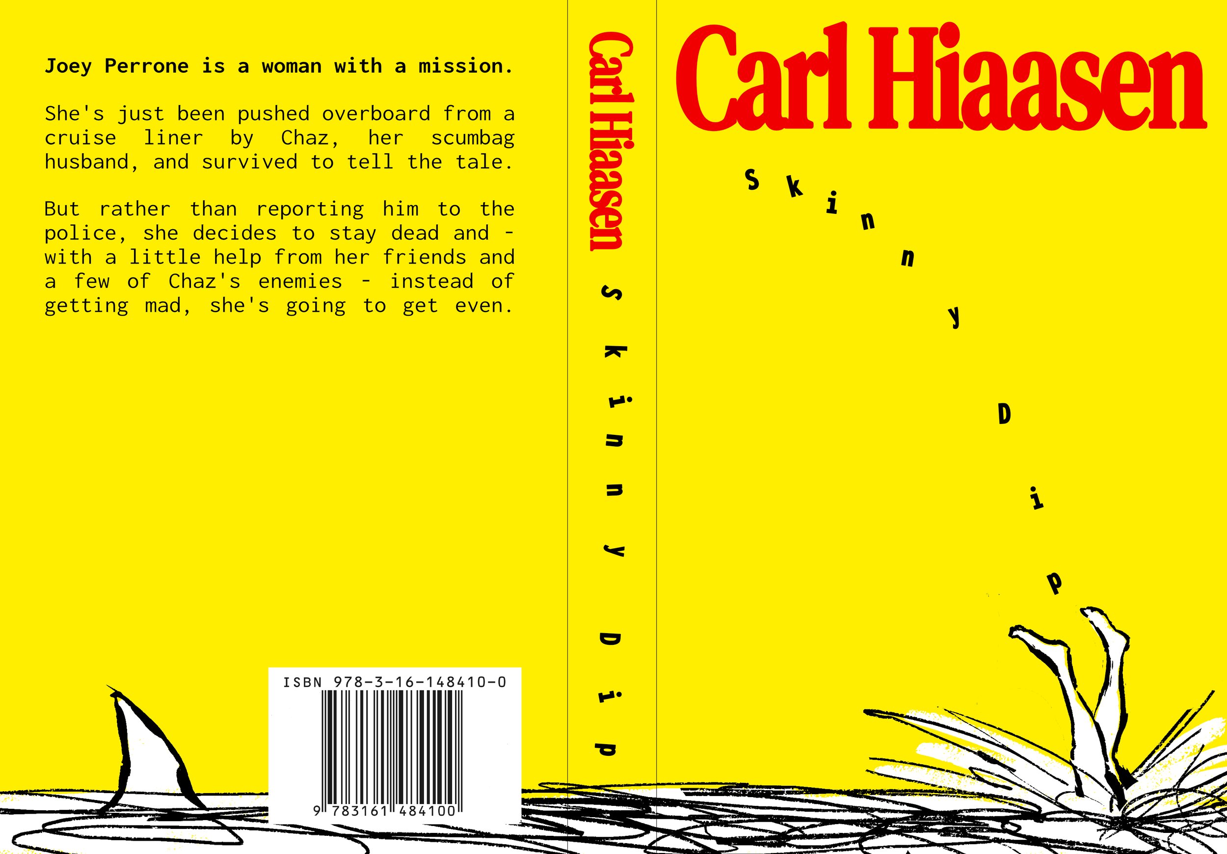 Cover for Skinny Dip by Carl Hiaasen. Hiaasen’s characters and plot border on cartoonish (in the best way), which inspired me to be playful with typography and illustration.